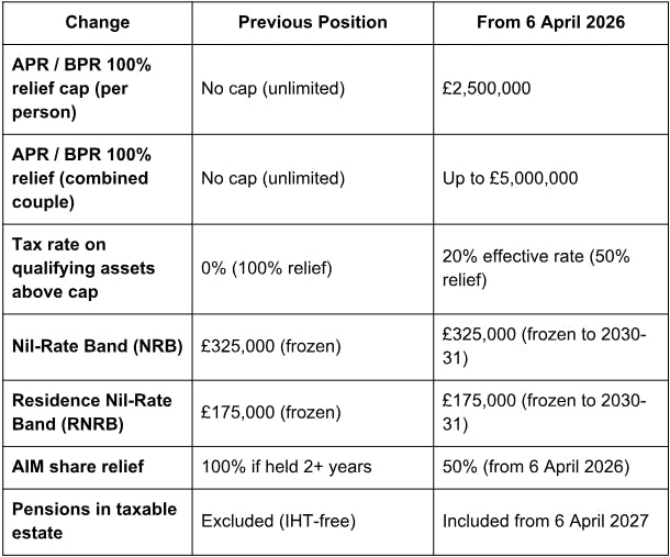 - From 6 April 2026, Agricultural Property Relief (APR) and Business Property Relief (BPR) will be capped at £2.5 million per person at the 100% rate